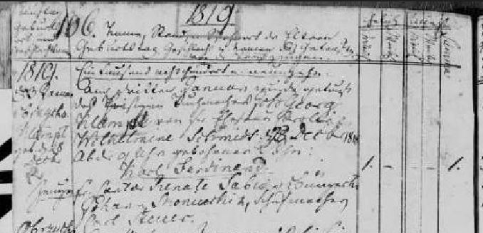Familie Johann George Klembt (verh. Schmidt) Geburt Karl Ferdinand Klembt (28.12.1818) admin 16.04.2023 Am 3. Januar 1819 zeigte der Tuchmacher Joh. Georg Klembt an, dass von seiner Ehefrau Caroline Wilhelmine Schmidt am 28. December 1818 ein Sohn geboren wurde: Karl Ferdinand Continue Reading Previous: Geburt Caroline Emilie Klembt (20.04.1821)Next: Geburt Johann Gottfried Klembt (21.07.1816) Related Stories Familie Johann George Klembt Familie Johann George Klembt (verh. Schmidt) Familien Familie Johann George Klembt 30.07.2023 Heirat Johann George Klembt / Caroline Wilhelmine Schmidt (14.08.1813) Familie Johann George Klembt (verh. Schmidt) Heirat Johann George Klembt / Caroline Wilhelmine Schmidt (14.08.1813) 16.04.2023 Todgeburt Klembt/Schmidt (30.07.1815) Familie Johann George Klembt (verh. Schmidt) Todgeburt Klembt/Schmidt (30.07.1815) 30.07.2023