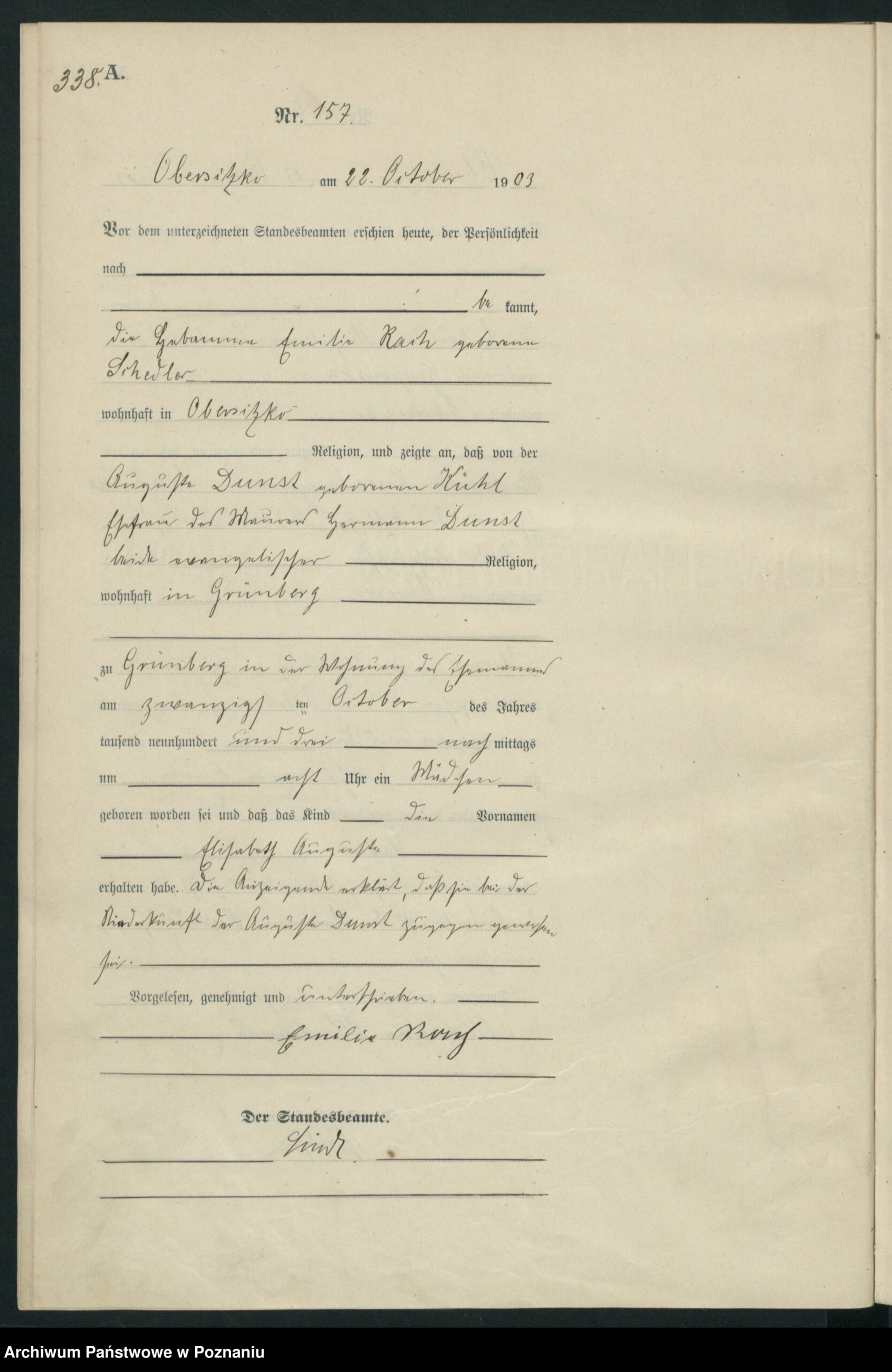 Familie Auguste Bertha Kühl (verh. Dunst) Geburt Elisabeth Auguste Dunst (20.10.1903) admin 26.02.2023 Standesamt Obersitzko 1903/157 Die Hebamme zeigt an, dass von der Auguste Dunst (geb. Kühl), Ehefrau des Maurers Hermann Dunst, am 20.10.1903 in Grünberg eine Tochter geboren wurde und sie die Vornamen Elisabeth Auguste erhalten habe. Continue Reading Previous: Geburt Frieda Mathilde Dunst (11.09.1905)Next: Geburt Richard Fritz Dunst (23.08.1902) Related Stories Heirat Julius Hermann Dunst / Auguste Bertha Kühl (15.01.1898) Familie Auguste Bertha Kühl (verh. Dunst) Heirat Julius Hermann Dunst / Auguste Bertha Kühl (15.01.1898) 26.02.2023 Geburt Arthur Hermann Dunst (10.09.1899) Familie Auguste Bertha Kühl (verh. Dunst) Geburt Arthur Hermann Dunst (10.09.1899) 26.02.2023 Geburt Otto Richard Dunst (11.10.1900) Familie Auguste Bertha Kühl (verh. Dunst) Geburt Otto Richard Dunst (11.10.1900) 26.02.2023