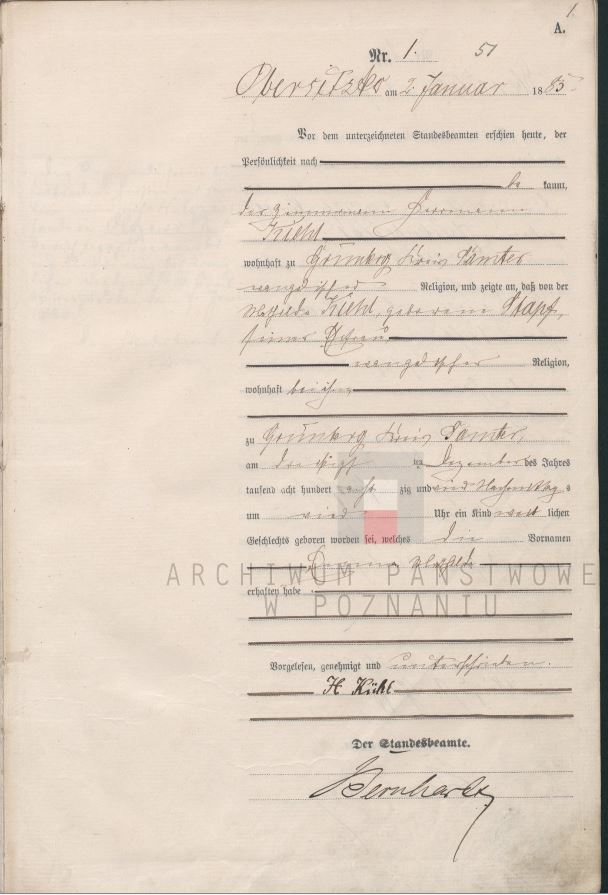 Familie Auguste Mathilde Stapf (verh. Kühl) Geburt Emma Mathilde Kühl (30.12.1884) admin 25.02.2023 Standesamt Obersitzko 1885/1 Der Zimmermann Hermann Kühl zeigt an, dass von seiner Ehefrau Mathilde (geb. Stapf) am 30.12.1884 in Grünberg eine Tochter geboren wurde und sie die Vornamen Emma Mathilde erhalten habe. Continue Reading Previous: Geburt Hedwig Ernestine Kühl (1887)Next: Todgeburt Kühl/Stapf (1884) Related Stories Geburt Auguste Bertha Kühl (1874) Familie Auguste Mathilde Stapf (verh. Kühl) Geburt Auguste Bertha Kühl (1874) 25.02.2023 Heirat Hermann Kühl / Auguste Mathilde Stapf ( ) Familie Auguste Mathilde Stapf (verh. Kühl) Heirat Hermann Kühl / Auguste Mathilde Stapf ( ) 25.02.2023 Geburt Robert Otto Kühl (09.01.1877) Familie Auguste Mathilde Stapf (verh. Kühl) Geburt Robert Otto Kühl (09.01.1877) 25.02.2023