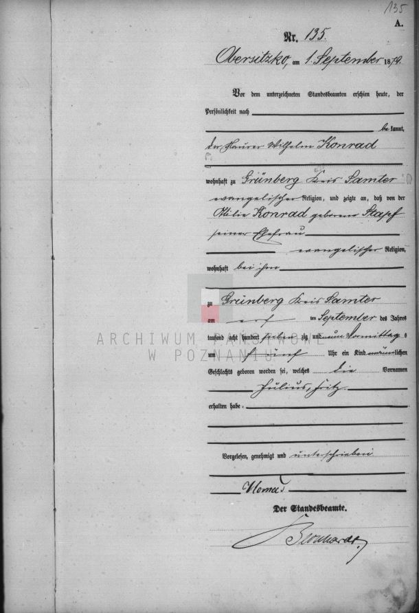 Familie Marie Ottilie Stapf (verh. Konrad) Geburt Julius Fritz Konrad (01.09.1879) admin 11.02.2023 Der Maurer Wilhelm Konrad zeigt an, dass seine Ehefrau Ottilie (geb. Stapf) am 01.09.1879 einen Sohn geboren und den Namen Julius Fritz erhalten habe. Continue Reading Previous: Geburt Pauline Wanda Konrad (12.12.1880)Next: Geburt Reinhold August Konrad (22.02.1878) Related Stories Heirat Karl Wilhelm Konrad / Marie Ottilie Stapf (01.01.1877) Familie Marie Ottilie Stapf (verh. Konrad) Heirat Karl Wilhelm Konrad / Marie Ottilie Stapf (01.01.1877) 11.02.2023 Geburt Anna Ottilie Konrad (1877) Familie Marie Ottilie Stapf (verh. Konrad) Geburt Anna Ottilie Konrad (1877) 11.02.2023 Geburt Reinhold August Konrad (22.02.1878) Familie Marie Ottilie Stapf (verh. Konrad) Geburt Reinhold August Konrad (22.02.1878) 11.02.2023