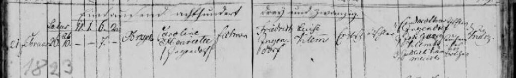 Familie Friedrich Ingendorf (verh. Klembt) Geburt Karoline Henriette Ingendorf (26.02.1823) admin 11.05.2023 Kirchenbuch Obersitzko 1823/21 Am 26.02.1823 wird Caroline Henriette Ingendorf, Tochter des Friedrich INgendorf und der Luise (geb. Klem) in Obersitzko geboren. Continue Reading Previous: Geburt Karl Gustav Ingendorf (07.06.1825)Next: Geburt Friedrich Ferdinand Ingendorf (10.05.1821) Related Stories Geburt Caroline Wilhelmine Ingendorf (01.10.1816) Familie Friedrich Ingendorf (verh. Klembt) Geburt Caroline Wilhelmine Ingendorf (01.10.1816) 25.06.2023 Heirat Friedrich Ingendorf / Johanna Louise Klembt (18.01.1817) Familie Friedrich Ingendorf (verh. Klembt) Heirat Friedrich Ingendorf / Johanna Louise Klembt (18.01.1817) 11.05.2023 Geburt Johann Gotthilf Ingendorf (12.08.1818) Familie Friedrich Ingendorf (verh. Klembt) Geburt Johann Gotthilf Ingendorf (12.08.1818) 11.05.2023