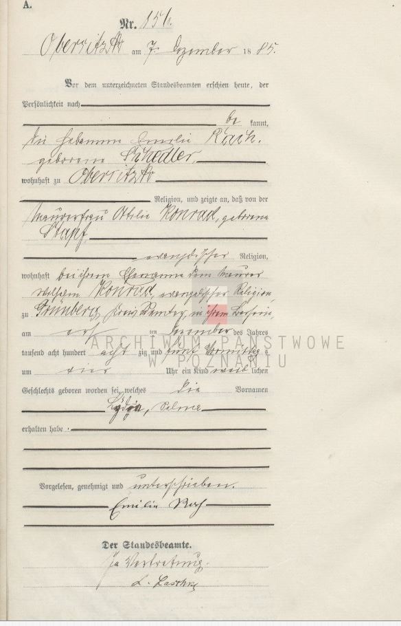 Familie Marie Ottilie Stapf (verh. Konrad) Geburt Lydia Selma Konrad (01.12.1885) admin 11.02.2023 Die Hebamme zeigt an , dass von der Maurerfrau Ottilie Konrad (geb. Stapf), Ehefrau des Maurers Wilhelm Konrad am 01.12.1885 in Grünberg eine Tochter geboren und den Namen Lydia Selma erhalten habe. Continue Reading Previous: Tod Karl Wilhelm Konrad (24.12.1886)Next: Geburt Alma Adelheid Konrad (17.10.1884) Related Stories Heirat Karl Wilhelm Konrad / Marie Ottilie Stapf (01.01.1877) Familie Marie Ottilie Stapf (verh. Konrad) Heirat Karl Wilhelm Konrad / Marie Ottilie Stapf (01.01.1877) 11.02.2023 Geburt Anna Ottilie Konrad (1877) Familie Marie Ottilie Stapf (verh. Konrad) Geburt Anna Ottilie Konrad (1877) 11.02.2023 Geburt Reinhold August Konrad (22.02.1878) Familie Marie Ottilie Stapf (verh. Konrad) Geburt Reinhold August Konrad (22.02.1878) 11.02.2023