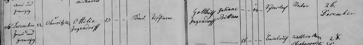 Familie Johann Gotthilf Ingendorf (verh. Bittner) Geburt Ottilie Ingendorf (22.12.1865) admin 29.06.2023 Am 22.12.1865 wurde Ottilie Ingendorf, Tochter des Gotthilf Ingendorf und der Juliane (geb. Bittner) in Obersitzko geboren. Continue Reading Previous: Geburt Emilie Auguste Ingendorf (29.09.1866)Next: Geburt Robert Ingendorf (26.07.1863) Related Stories Heirat Johann Gotthilf Ingendorf / Juliane Bittner (09.07.1846) Familie Johann Gotthilf Ingendorf (verh. Bittner) Heirat Johann Gotthilf Ingendorf / Juliane Bittner (09.07.1846) 11.05.2023 Geburt Friederike Ottilie Ingendorf (1853) Familie Johann Gotthilf Ingendorf (verh. Bittner) Geburt Friederike Ottilie Ingendorf (1853) 11.05.2023 Geburt Carl Gustav Ingendorf (10.12.1859) Familie Johann Gotthilf Ingendorf (verh. Bittner) Geburt Carl Gustav Ingendorf (10.12.1859) 28.06.2023