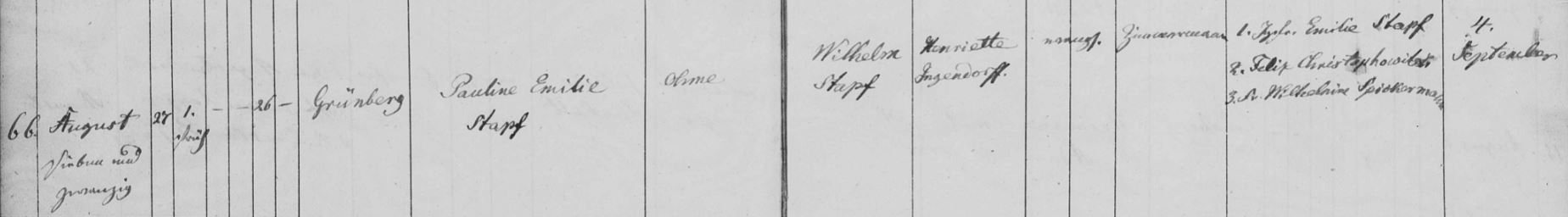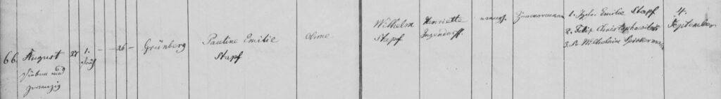 Familie Friedrich Wilhelm Stapf (verh. Ingendorf) Geburt Pauline Emilie Stapf (27.08.1864) admin 25.01.2023 Kirchenbuch Obersitzko 1864/66 BildNr 145 Pauline Emilie Stapf, geboren den 27.08.1864 in Grünberg, Tochter des Wilhelm Stapf und der Henriette Ingendroff, getauft den 04.09.1864, Pathen waren:1. Jgf. Emilie Stapf2. Felix Christochowitsch3. Fr. Wilhelmine Spiekermann Continue Reading Previous: Tod Otto Stapf (23.07.1865)Next: Todgeburt Stapf/Ingendorf (31.07.1863) Related Stories Familie Friedrich Wilhelm Stapf Familie Friedrich Wilhelm Stapf (verh. Ingendorf) Familien Familie Friedrich Wilhelm Stapf 29.01.2023 Geburt Gustav Heinrich Stapf (15.08.1848) Familie Friedrich Wilhelm Stapf (verh. Ingendorf) Geburt Gustav Heinrich Stapf (15.08.1848) 25.01.2023 Heirat Friedrich Wilhelm Stapf / Henriette Ingendorf (17.09.1848) Familie Friedrich Wilhelm Stapf (verh. Ingendorf) Heirat Friedrich Wilhelm Stapf / Henriette Ingendorf (17.09.1848) 24.01.2023