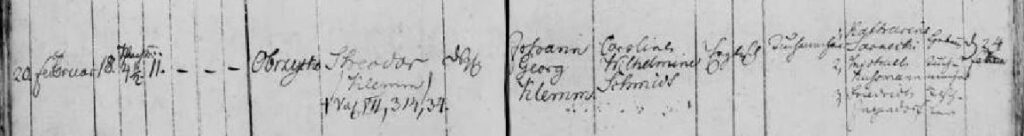 Familie Johann George Klembt (verh. Schmidt) Geburt Theodor Klembt (18.02.1823) admin 16.04.2023 Am 18.02.1823 wird Theodor Klembt, Sohn des Johann Georg Klembt und Caroline Wilhelmine Schmidt in Obersitzko geboren. Continue Reading Previous: Geburt Julius Klembt (20.04.1825)Next: Geburt Caroline Emilie Klembt (20.04.1821) Related Stories Familie Johann George Klembt Familie Johann George Klembt (verh. Schmidt) Familien Familie Johann George Klembt 30.07.2023 Heirat Johann George Klembt / Caroline Wilhelmine Schmidt (14.08.1813) Familie Johann George Klembt (verh. Schmidt) Heirat Johann George Klembt / Caroline Wilhelmine Schmidt (14.08.1813) 16.04.2023 Todgeburt Klembt/Schmidt (30.07.1815) Familie Johann George Klembt (verh. Schmidt) Todgeburt Klembt/Schmidt (30.07.1815) 30.07.2023