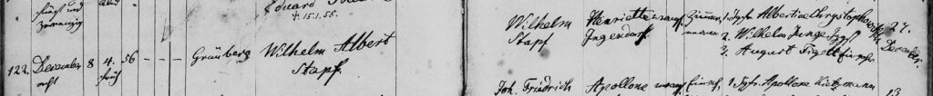 Familie Friedrich Wilhelm Stapf (verh. Ingendorf) Geburt Wilhelm Albert Stapf (08.12.1857) admin 25.01.2023 Kirchenbuch Obersitzko 1857/122 BildNr 676 Wilhelm Albert Stapf, geboren den 08.12.1857 in Grünberg, Sohn des Wilhelm Stapf und der Henriette Ingendorff, getauft am 27.12.1857, Pathen waren:1. Jgf. Albertine Christochowitsch2. Jgs. Wilhelm Junge3. August Fiegelt, Einwohner Continue Reading Previous: Geburt Emma Auguste Stapf (07.01.1860)Next: Geburt Otto Stapf (13.12.1855) Related Stories Familie Friedrich Wilhelm Stapf Familie Friedrich Wilhelm Stapf (verh. Ingendorf) Familien Familie Friedrich Wilhelm Stapf 29.01.2023 Geburt Gustav Heinrich Stapf (15.08.1848) Familie Friedrich Wilhelm Stapf (verh. Ingendorf) Geburt Gustav Heinrich Stapf (15.08.1848) 25.01.2023 Heirat Friedrich Wilhelm Stapf / Henriette Ingendorf (17.09.1848) Familie Friedrich Wilhelm Stapf (verh. Ingendorf) Heirat Friedrich Wilhelm Stapf / Henriette Ingendorf (17.09.1848) 24.01.2023