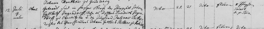 Familie Johann Gotthilf Ingendorf (verh. Bittner) Heirat Johann Gotthilf Ingendorf / Juliane Bittner (09.07.1846) admin 11.05.2023 Am 09.07.1846 sind getraut in hiesiger Kirch der Junggesell Johann Gotthilf Ingendorf (25 J. alt), Sohn des Tischlers Friedrich Ingendorf zu Obersitzko und die Jungfrau Juliane Bittner (21 j. alt), Tochter des ? Johann Gottlieb Bittner aus Kobelnik Continue Reading Previous: Geburt Friederike Ottilie Ingendorf (1853) Related Stories Geburt Friederike Ottilie Ingendorf (1853) Familie Johann Gotthilf Ingendorf (verh. Bittner) Geburt Friederike Ottilie Ingendorf (1853) 11.05.2023 Geburt Carl Gustav Ingendorf (10.12.1859) Familie Johann Gotthilf Ingendorf (verh. Bittner) Geburt Carl Gustav Ingendorf (10.12.1859) 28.06.2023 Tod Carl Gustav Ingendorf (21.11.1860) Familie Johann Gotthilf Ingendorf (verh. Bittner) Tod Carl Gustav Ingendorf (21.11.1860) 29.06.2023
