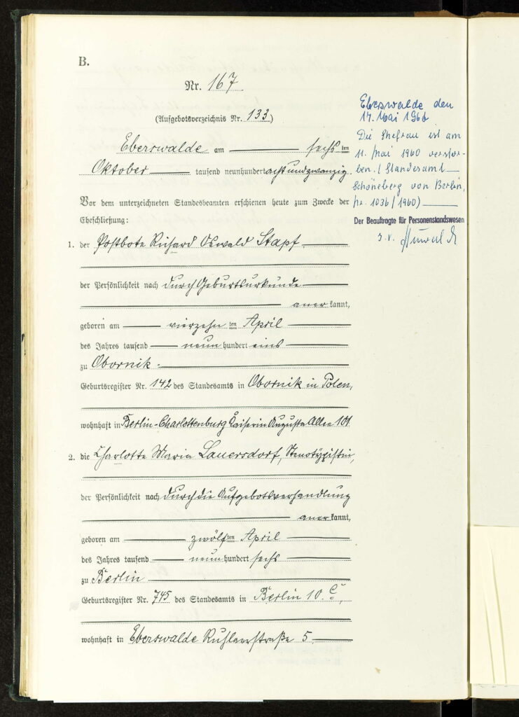 Heirat Richard Oswald Stapf / Charlotte Maria Lauersdorf (06.10.1928)