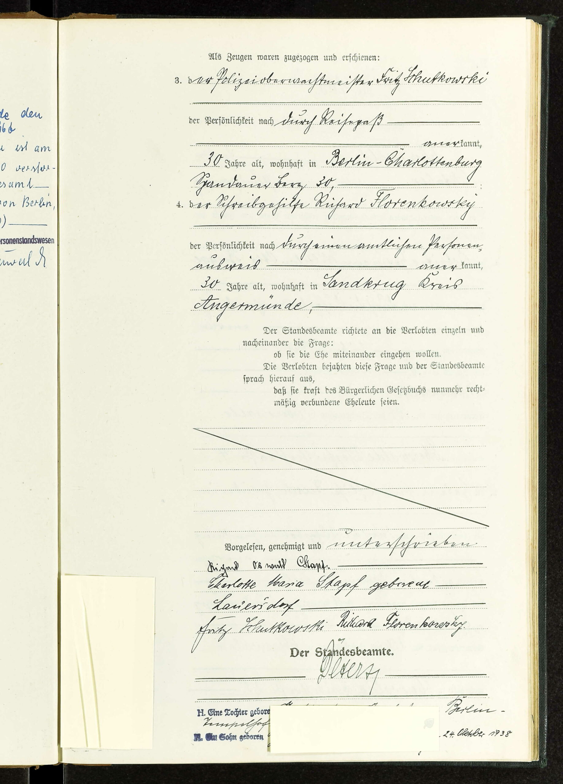 Zeugen waren der Polizeiobermeister Fritz Schutkowski (30 Jahre alt) aus Berlin und der Schreibgehilfe Richard Florenkowsky (30 Jahre alt) aus Sandkrug (Kreis Angermünde).