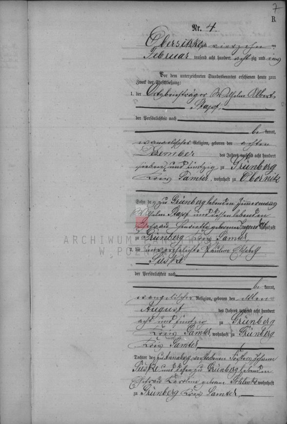 die unverehelichte Pauline Elisabeth Sieske, geboren den 11.08.1858 in Grünberg, Tochter des zu Annaberg (Kreis Samter) verstorbenen Försters Johann Sieske und der in Grünberg lebenden Ehefrau Karoline (geb. Schlinke)