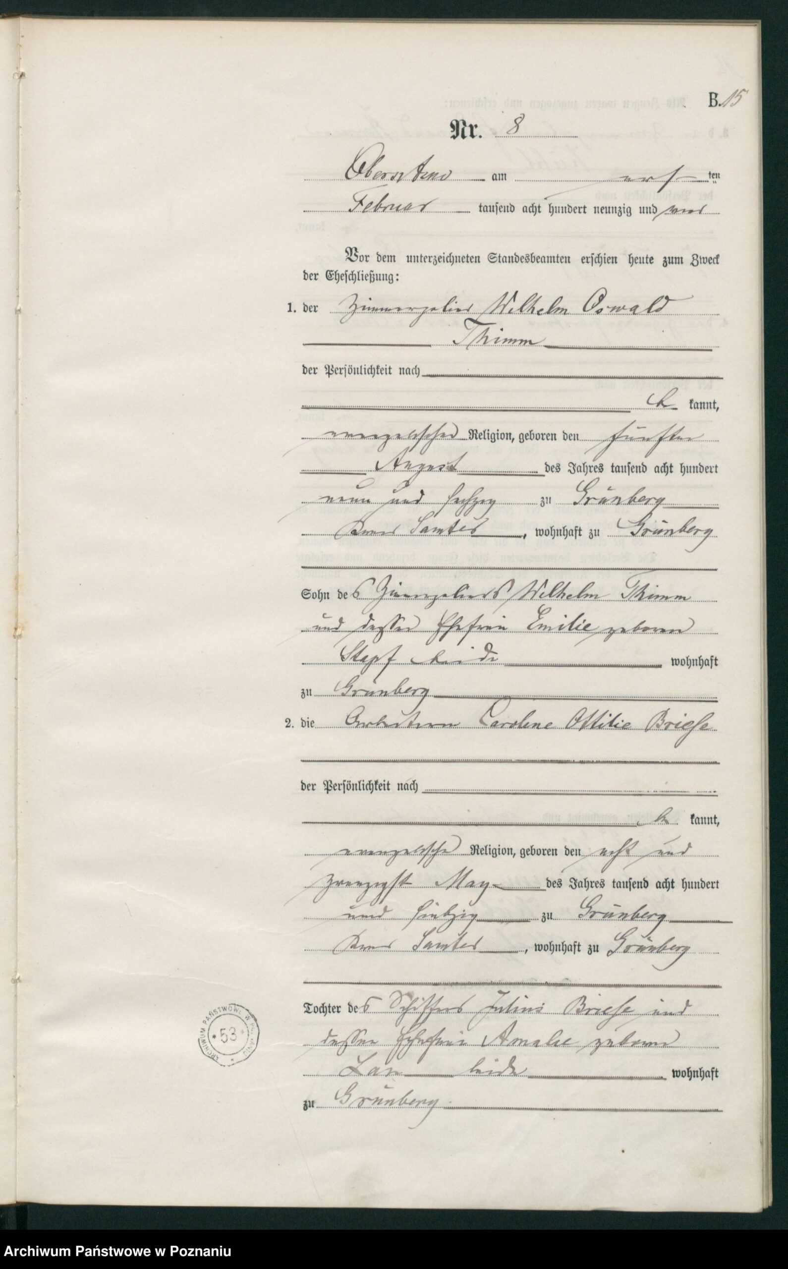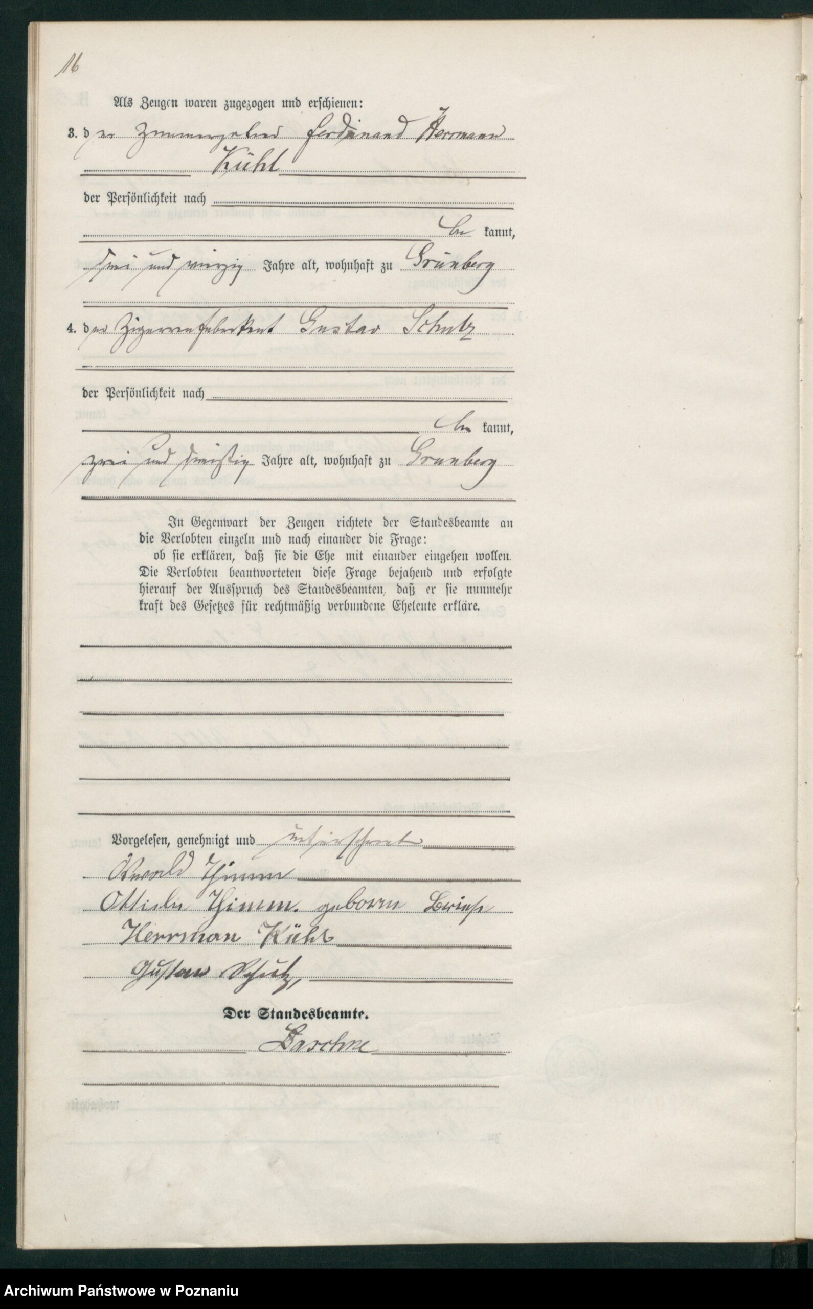 Zeugen waren der Zimmerpolier Ferdinand Hermann Kühl (43 Jahre alt) aus Grünberg und der Zigarrenfabrikant Gustav Schulz (32 Jahre alt) aus Grünberg.