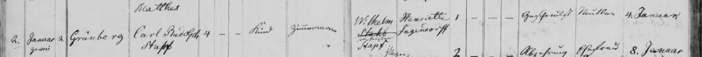 Familie Friedrich Wilhelm Stapf (verh. Ingendorf) Tod Carl Rudolph Stapf (02.01.1854) admin 25.01.2023 Kirchenbuch Obersitzko 1854/2 BildNr 688 Carl Rudolph Stapf, gestorben in Grünberg am 02.01.1854 im Alter von 4 Jahren an einer Geschwulst, Sohn des Wilhelm Stapf und der Henriette Ingendorff, beerdigt am 04.01.1854 Continue Reading Previous: Geburt Otto Stapf (13.12.1855)Next: Tod Gustav Heinrich Stapf (04.12.1853) Related Stories Familie Friedrich Wilhelm Stapf Familie Friedrich Wilhelm Stapf (verh. Ingendorf) Familien Familie Friedrich Wilhelm Stapf 29.01.2023 Geburt Gustav Heinrich Stapf (15.08.1848) Familie Friedrich Wilhelm Stapf (verh. Ingendorf) Geburt Gustav Heinrich Stapf (15.08.1848) 25.01.2023 Heirat Friedrich Wilhelm Stapf / Henriette Ingendorf (17.09.1848) Familie Friedrich Wilhelm Stapf (verh. Ingendorf) Heirat Friedrich Wilhelm Stapf / Henriette Ingendorf (17.09.1848) 24.01.2023