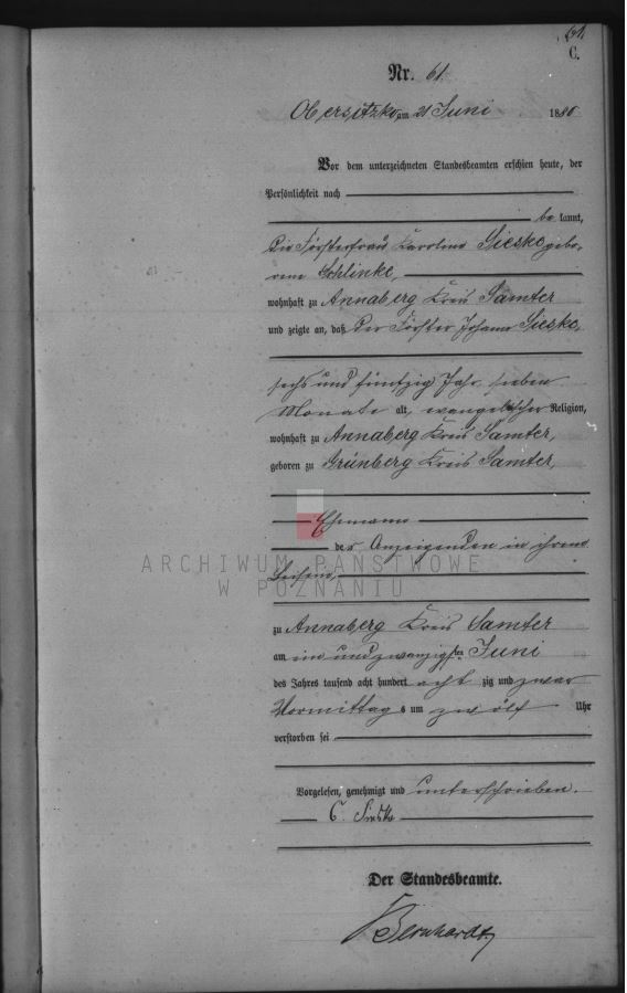 Familie Johann Sieske (verh. Schlinke) Tod Johann Sieske (21.06.1880) admin 09.02.2023 Die Försterfrau Caroline Sieske (geb. Schlinke) zeigt an, dass ihr Ehemann der Förster Johann Sieske (56 Jahre und 7 Monate alt) am 21.06.1880 in Annaberg verstorben sei. Continue Reading Previous: Tod Caroline Schlinke (25.09.1896)Next: Geburt Eduard Ernst Sieske (03.11.1860) Related Stories Heirat Johann Sieske / Caroline Schlinke (1848) Familie Johann Sieske (verh. Schlinke) Heirat Johann Sieske / Caroline Schlinke (1848) 02.08.2023 Geburt Hermann Albert Sieske (01.12.1848) Familie Johann Sieske (verh. Schlinke) Geburt Hermann Albert Sieske (01.12.1848) 02.08.2023 Todgeburt Sieske/Schlinke (17.04.1850) Familie Johann Sieske (verh. Schlinke) Todgeburt Sieske/Schlinke (17.04.1850) 02.08.2023