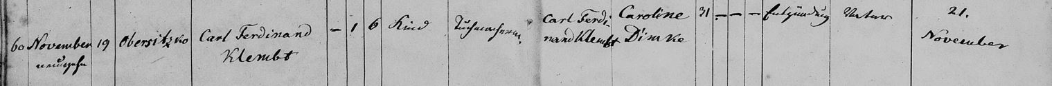 Familie Karl Ferdinand Klembt (verh. Dimke) Tod Carl Ferdinand Klembt (19.11.1862) admin 16.04.2023 Carl Ferdinand Klembt, Sohn des Tuchmachers Carl Ferdinand Klembt und der Caroline (geb. Dimke) am 19.11.1862 in Obersitzko an einer Entzündung im Alter von 1 Monat und 6 Tagen verstorben. Continue Reading Previous: Todgeburt Klembt/Dimke (03.04.1864)Next: Geburt Carl Ferdinand Klembt (31.03.1861) Related Stories Familie Karl Ferdinand Klembt Familie Karl Ferdinand Klembt (verh. Dimke) Familien Familie Karl Ferdinand Klembt 30.07.2023 Heirat Karl Ferdinand Klembt / Caroline Dimke (25.04.1858) Familie Karl Ferdinand Klembt (verh. Dimke) Heirat Karl Ferdinand Klembt / Caroline Dimke (25.04.1858) 07.02.2023 Geburt Wilhelmine Ottilie Klembt (05.03.1859) Familie Karl Ferdinand Klembt (verh. Dimke) Geburt Wilhelmine Ottilie Klembt (05.03.1859) 07.02.2023